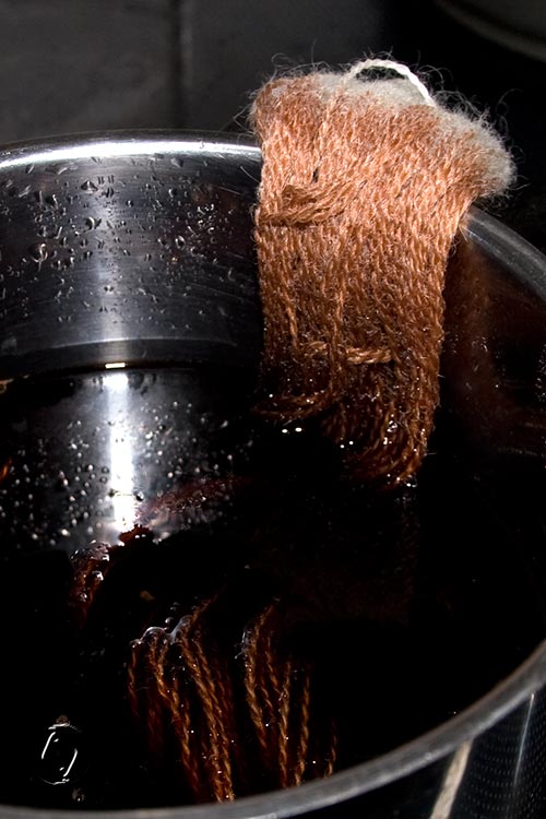 I added the liquid and the chestnuts to a larger pot of water and simmered with two 35 g skeins at very low temps – because the first one looked so promising at first dip. I would have just left them in there to dye cold, but the pH was 11, so that’s not a good method for wool.