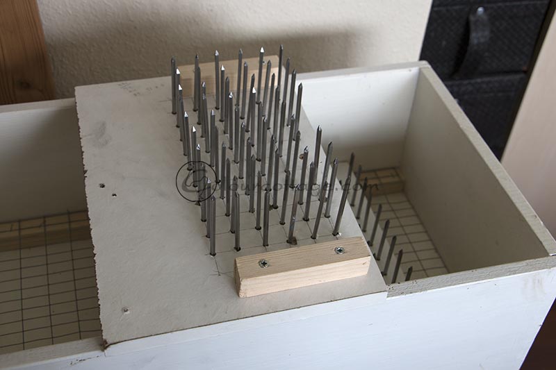 I’m not sure I’ll process fleeces again, the rational thing for me to keep my hobbies but save my “spoons” would be doing some artistic spinning, not production. So I’ve made a crude, quick and cheap device that I’m hoping works ok for small batches. I had the box already and made it so that can be used again later should I wish it, the other parts were found in the garage apart from the nails which are new and shiny. I haven’t gotten special ones or even sharpened them, as I said, crude. Besides, our local hardware store shut down, so supplies now require extra effort, planning and driving. 🙁